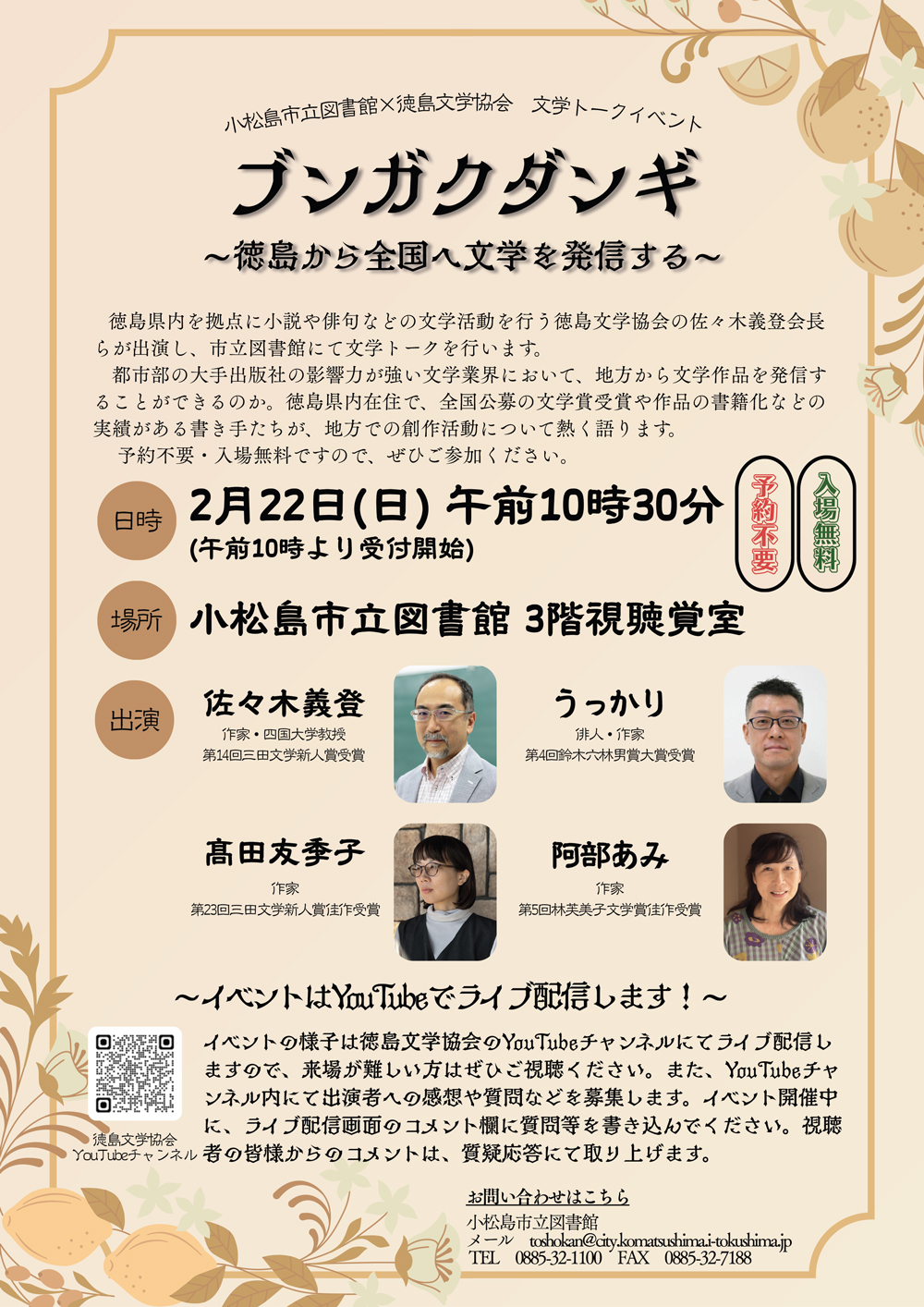 2月22日日曜日に小松島図書館で「ブンガクダンギ」イベントを開催しました。ご来場してくださった皆様、ユーチューブの配信をご覧いただいた皆様、誠にありがとうございます。